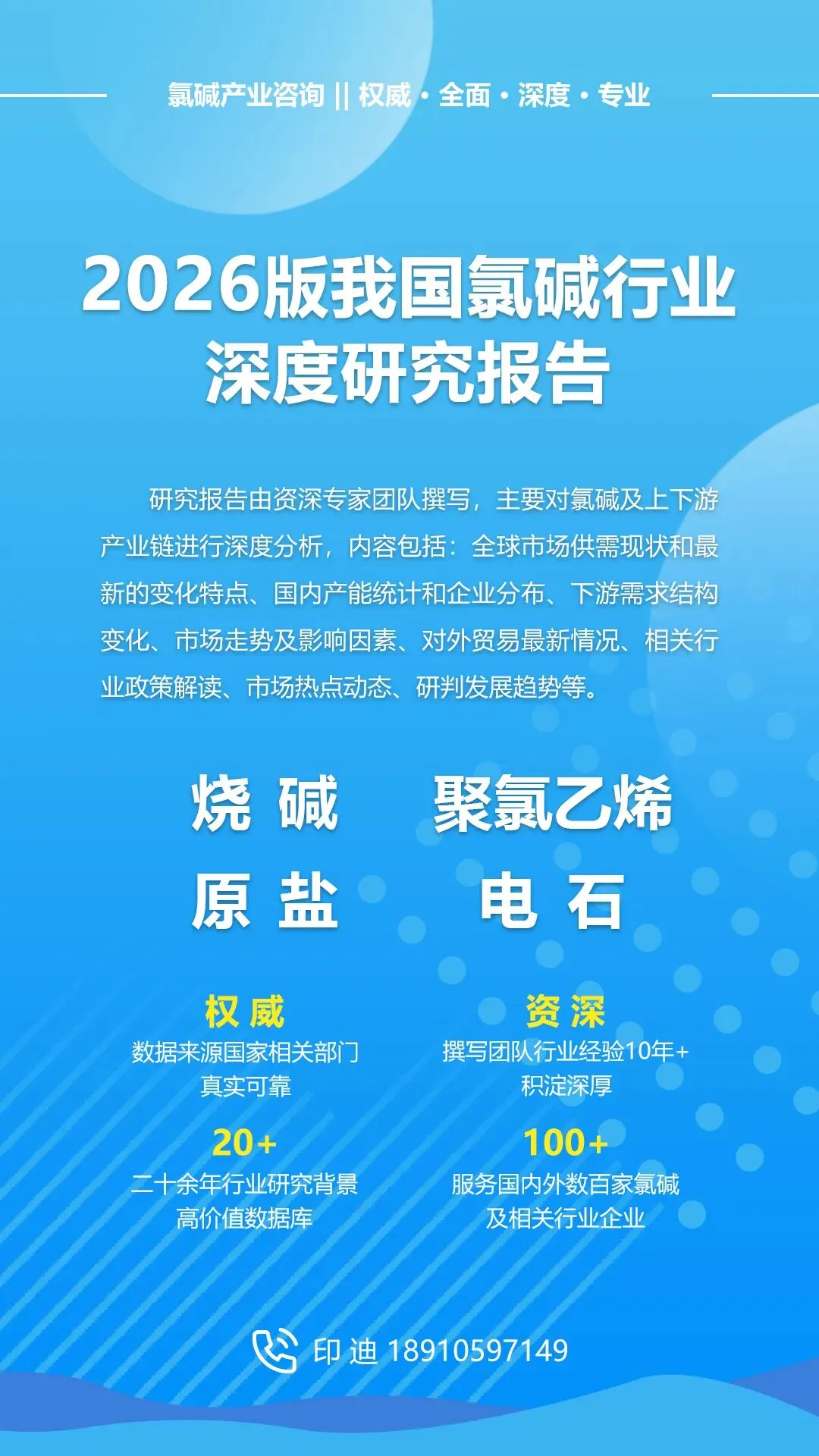 2026版我国氯碱行业深度研究报告预售,系列报告包含烧碱、聚氯乙烯、原盐和电石产品。研究报告由资深专家团队撰写,主要对氯碱及上下游产业链进行深度分析,内容包括:全球市场供需现状和最新的变化特点、国内产能统计和企业分布、下游需求结构变化、市场走势及影响因素、对外贸易最新情况、相关行业政策解读、市场热点动态、研判发展趋势等。