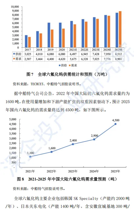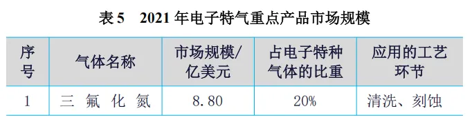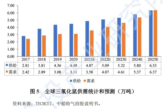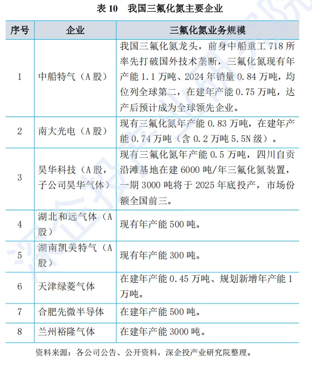 三氟化氮是市场规模最大的电子特气品种,是国产化突破的代表性产品。2021 年全球市场规模 8.8 亿美元,占电子特种气体比重 20%,主要用于集成电路刻蚀与清洗。2025 年全球需求预计达 6.37 万吨,中国是主要生产国,2023 年产能 2.5 万吨 / 年,已成为净出口产品,出口量是进口量的 7.39 倍。中船特气、南大光电、昊华科技是国内第一梯队,合计产能占国内主体,产品已进入台积电、中芯国际等头部供应链,但中低端产品面临价格内卷,高端向 5.5N 及以上纯度突破。