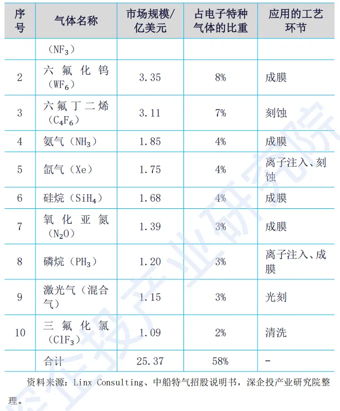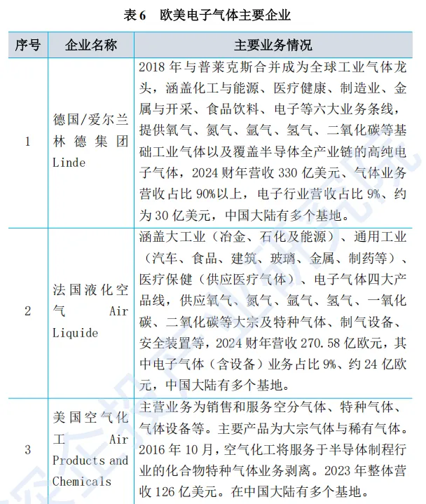全球电子气体市场规模约100亿美元,电子特气市场规模44.23亿美元,三氟化氮(NF₃) 是最大品类(8.8 亿美元,占 20%),其次为六氟化钨(3.35 亿美元,8%)、六氟丁二烯(3.11 亿美元,7%),以德国林德、法国液化空气、日本大阳日酸、美国空气化工为代表的 “四大巨头”,合计占据全球超 70% 市场份额;全球前十大企业市占率超 90%,形成极强的垄断格局。国内龙头已在细分领域形成竞争力(如中船特气的 WF₆、昊华科技的六氟丁二烯),但与国际巨头的 “全品类 + 全服务” 能力仍有差距,出现中低端产能过剩但高端依赖进口的情况。