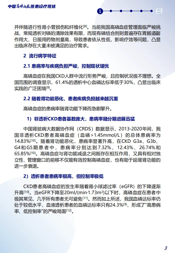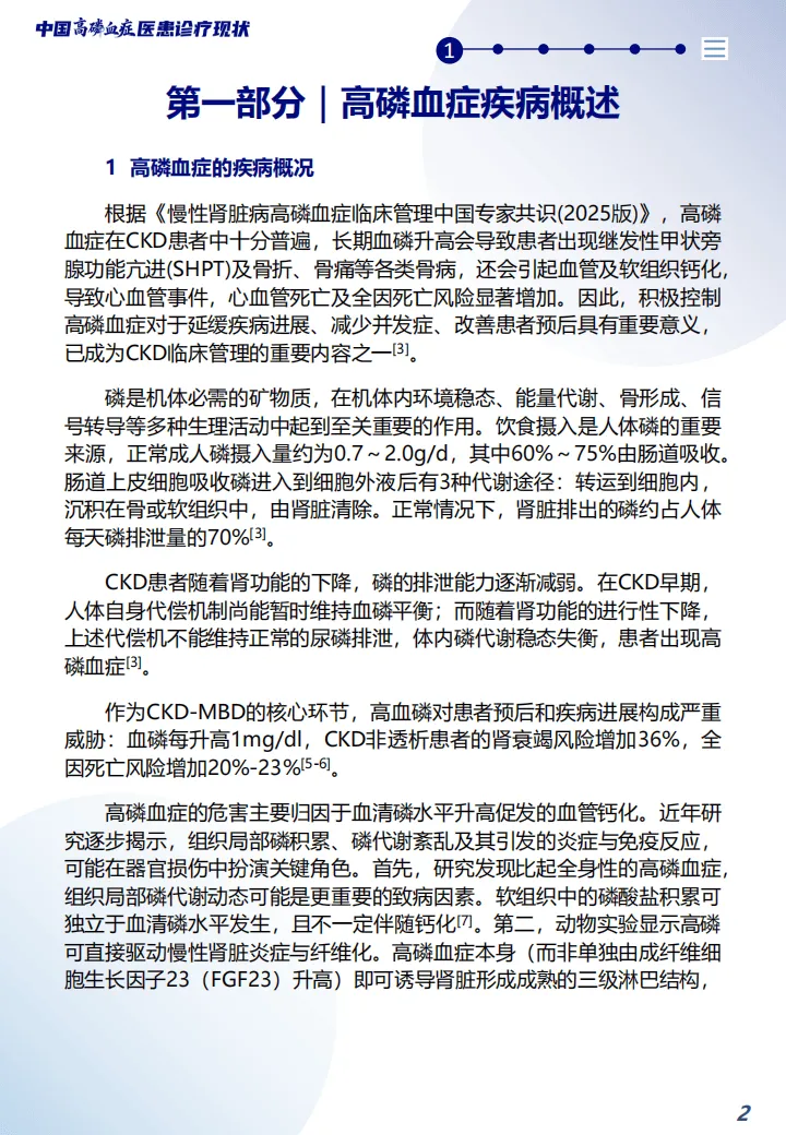 《中国高磷血症医患诊疗现状蓝皮书》系统梳理了我国高磷血症的诊疗现状、挑战与发展方向。作为慢性肾脏病(CKD)的重要并发症,高磷血症严重影响患者预后,其血磷升高会加速肾功能恶化,增加心血管事件及死亡风险,但因早期无症状,临床重视与患者认知均显不足。