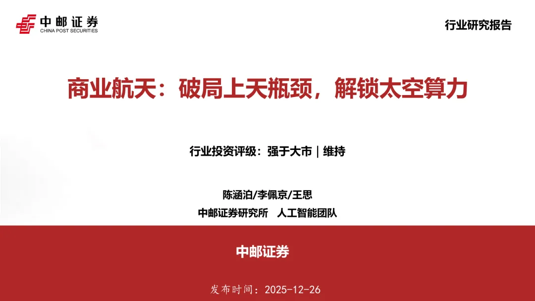 2025商业航天行业白皮书:可回收火箭破局,太空算力开启新赛道!《商业航天:破局上天瓶颈,解锁太空算力》显示,行业正通过可回收火箭、卫星规模化制造、专用发射场建设实现降本增效,太空算力成为高价值落地场景,商业航天进入规模化发展新阶段。
