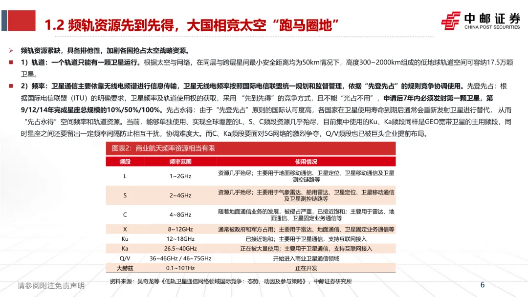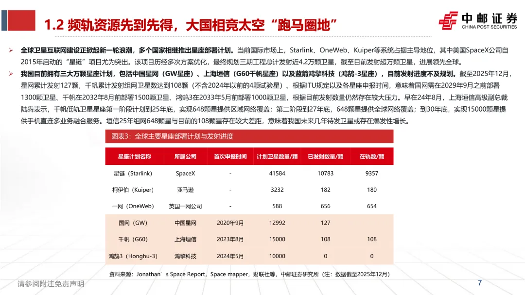 政策战略升维:商业航天纳入“航天强国”战略,连续两年写入政府工作报告,设立“商业航天司”统筹管理,2025-2027年行动计划推动高质量发展。 频轨资源竞争:低轨空间可容纳17.5万颗卫星,L/S/C频段资源接近枯竭,Ku/Ka频段饱和,各国加速星座部署,我国三大万颗星座需按期完成部署任务。 行业瓶颈凸显:我国发射成本约为SpaceX的7倍,2024年发射频次未达预期,主流火箭运力较SpaceX差距明显,制约规模化组网。