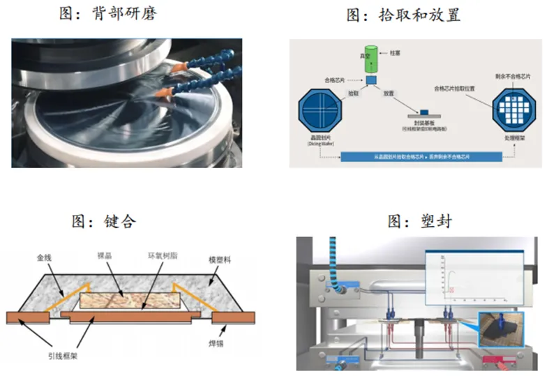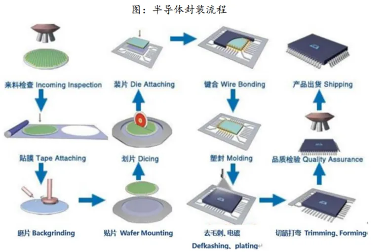 半导体封装流程主要包含了背部研磨;划片、拾取和放置;键合;塑封等。第一阶段为晶圆处理与切割。包含了来料检查、贴膜、磨片、贴片和划片等步骤。第二阶段为组装与互联。包含了装片、键合等环节。第三阶段为封装与后处理。包含了塑封、去毛刺和电镀、切筋打弯等步骤。第四阶段为测试与出货,包含了品质检测和产品出货等。