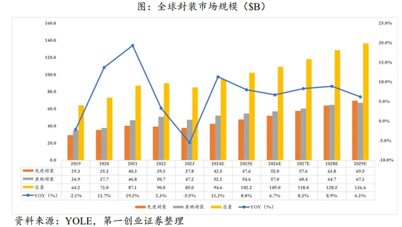 2019年到2029年先进封装的CAGR达8.9%;从2019年到2029年,先进封装占封装行业比例从45.6%攀升至50.9%。