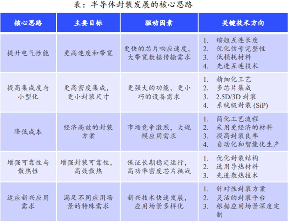 与之对应,半导体封装的核心思路有:提升电气性能、提高集成度与小型化、降低成本、增强可靠性与散热性和适应新型应用需求。