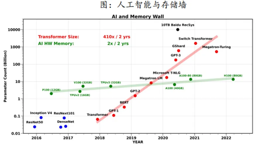 近20年,处理器峰值算力每两年提升3倍,而DRAM带宽每两年提升1.6倍,互连带宽每两年提升1.4倍,使存储器的发展远落后于处理器。AI领域,AI模型规模的指数级增长也远远超过了硬件内存容量的增长速度。