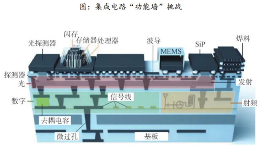 功能墙:单纯依靠单片集成电路(SoC)难以满足日益增长的复杂应用需求,难以集成传感器、模拟电路、射频电路、功率器件等。