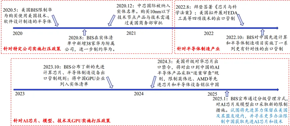 美国制定一系列打压政策,对中国的半导体行业进行打击。当前的打击重点为芯片制程、AI芯片、模型、技术及GPU等,力图遏制中国AI领域快速发展。在芯片封装领域中国受到的打压相对较少。