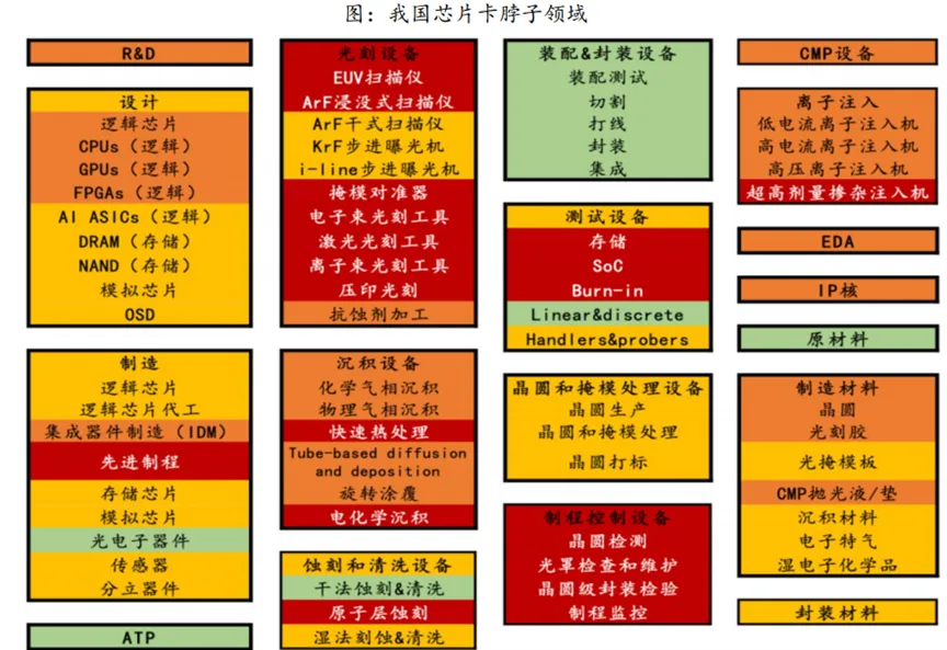 卡脖子技术:全球半导体产业链环节中,中国大陆在封装及封装设备领域已具备较强国际竞争力,但是在EDA、IP核、部分半导体材料、部分半导体设备领域存在明显的卡脖子问题(封装产业已成为AI芯片扩大产能的卡脖子环节)。下图中,绿色代表具有较强国际竞争力,黄色表示具备一定的竞争力,橙色表示竞争力微弱,红色表示几乎无竞争力。橙色和红色为卡脖子关键领域。