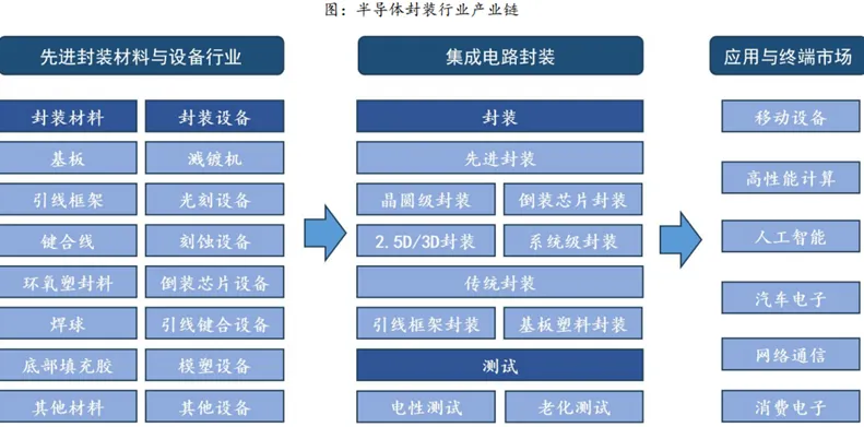 半导体封装上中下游分别为封装材料与设备、集成电路封装以及应用与终端市场。其中,上游提供封装所需的各种材料(基板、引线框架、键合线等)和设备(溅镀机、光刻设备等);中游进行各种封装工艺(传统封装、先进封装、晶圆级封装等)和测试(电性测试、老化测试);封装后的芯片应用于移动设备、高性能计算、人工智能和汽车电子等领域。