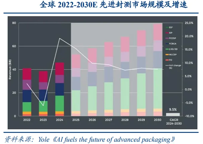 随着AI、高性能计算、5G、汽车电子等下游需求拉动,Yole预计到2030年全球先进封装市场规模将增长至约800亿美元,2024-2030年复合年增长率达到9.4%,成为推动半导体行业价值升级的核心环节。