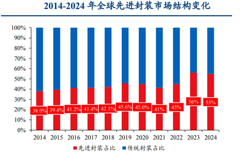 据Yole及中商产业研究院数据测算,2024年全球先进封装市场规模约为450亿美元,占全球半导体封装市场总额的55%左右。