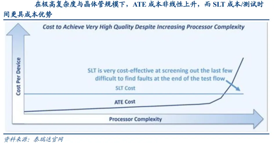 传统ATE测试基于结构化向量,主要验证物理电路的通断,但AI/HPC芯片在真实负载下涉及软硬件协同、互连与内存子系统耦合等复杂工况,ATE难以覆盖全部系统级失效风险。SLT在模拟终端使用场景中对待测芯片(DUT)进行测试,通常通过加载操作系统/驱动并运行通用或目标应用来暴露系统交互类问题,且SLT成本/测试时间不随着复杂性的增加而增加,成本更具优势。当前所有主流CPU、APU和GPU在出货前都须经过SLT测试,成为后道测试的流程新增量。