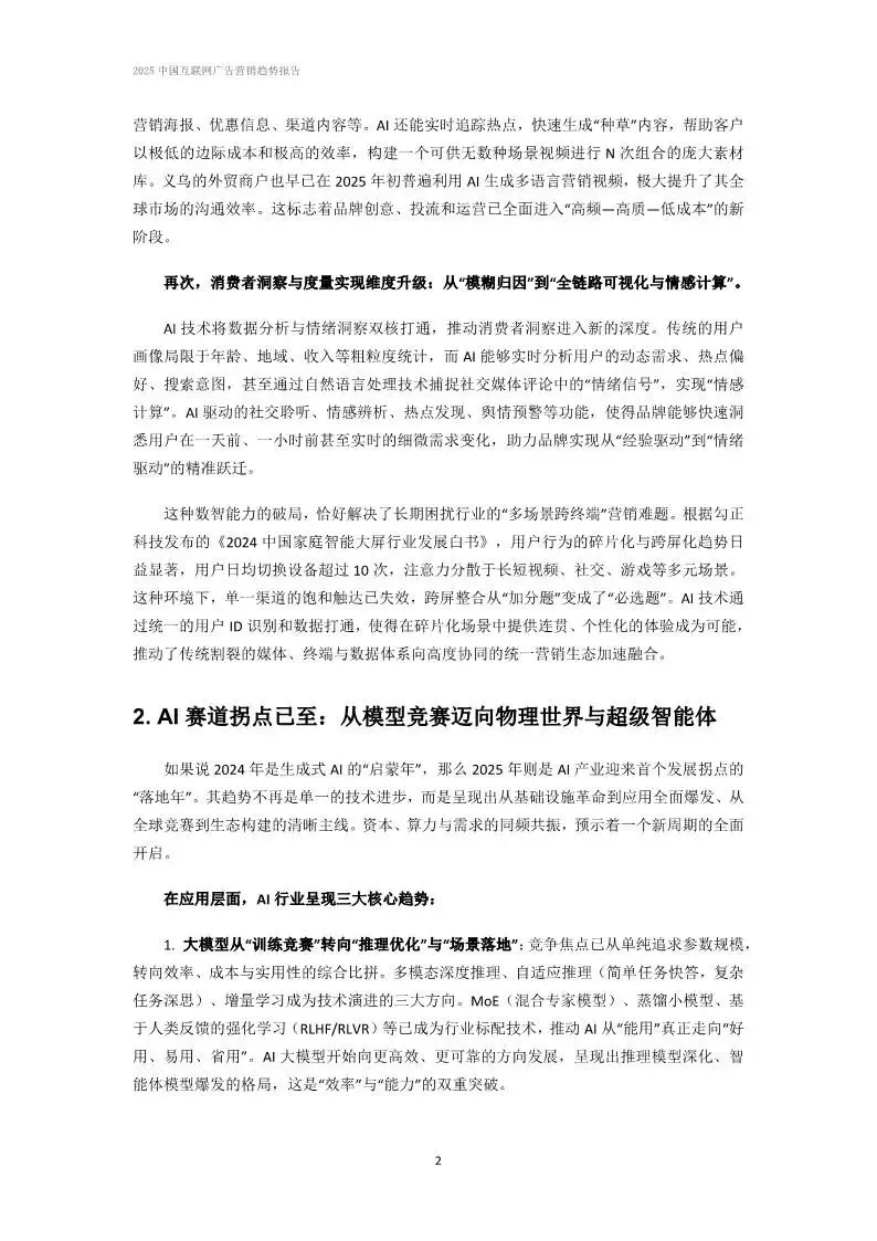 AI 技术成为核心驱动力,数智营销实现关键突破。消费者决策从 “被动搜索” 转向 “信任 AI 推荐”,品牌开始构建适配 AI 的数字身份。AI 还解放了内容生产力,能批量生成个性化素材,义乌外贸商户已普遍用其制作多语言营销视频。跨屏整合成为必选题,AI 通过统一用户 ID,让碎片化场景中的连贯体验成为可能。