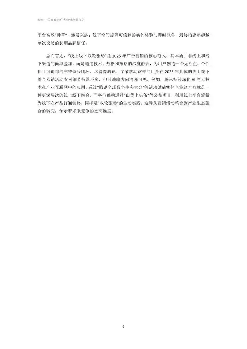 线上线下双轮驱动成为营销核心范式。面对线上流量红利见顶,品牌通过线上 “种草”、线下体验的方式,构建长期信任。2026 年行业竞争将聚焦 “深度” 与 “智能”,AI 全链路渗透和全场景融合将成为增长关键。