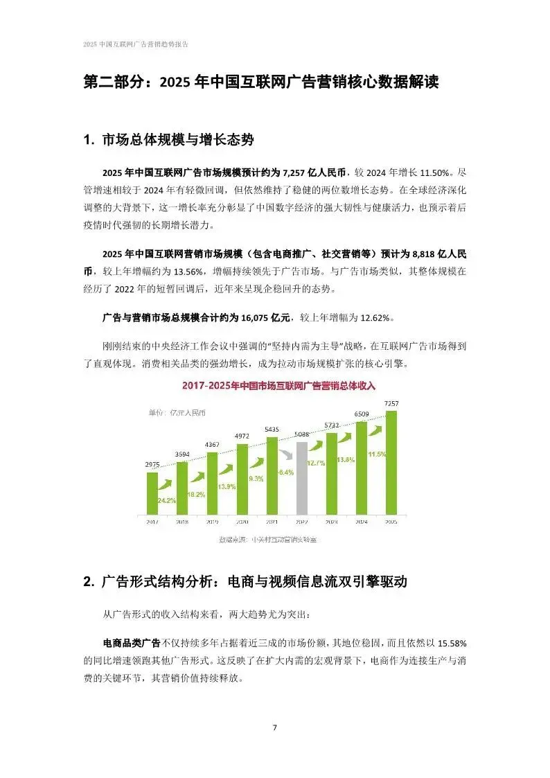 2025 年中国互联网广告市场规模达 7257 亿元,同比增长 11.5%,互联网营销市场规模更是达到 8818 亿元,增幅 13.56%。这标志着行业已告别流量扩张旧周期,迈入 “深度价值创造” 与 “智能生态协同” 的新纪元。