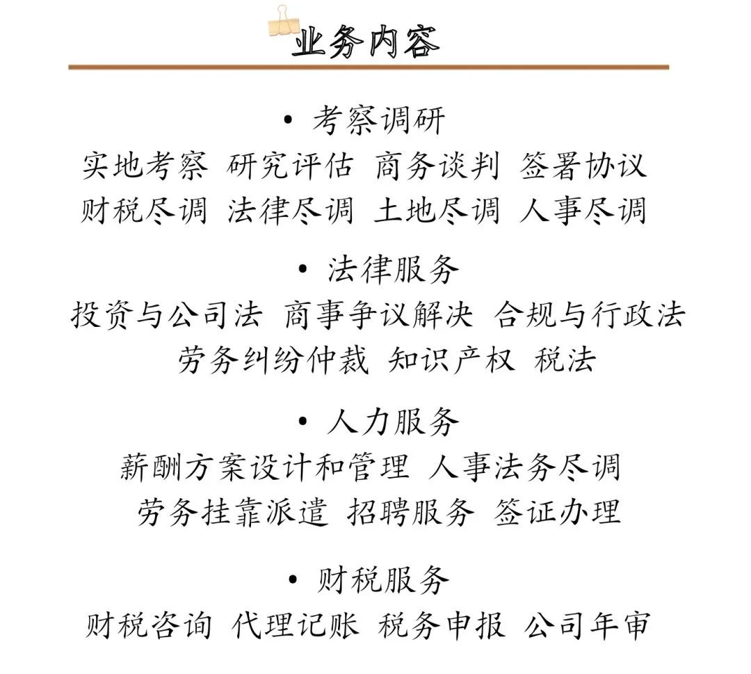 • 走访专业咨询公司(律所、会计师事务所、人资公司)了解法律、财税等相关政策情况