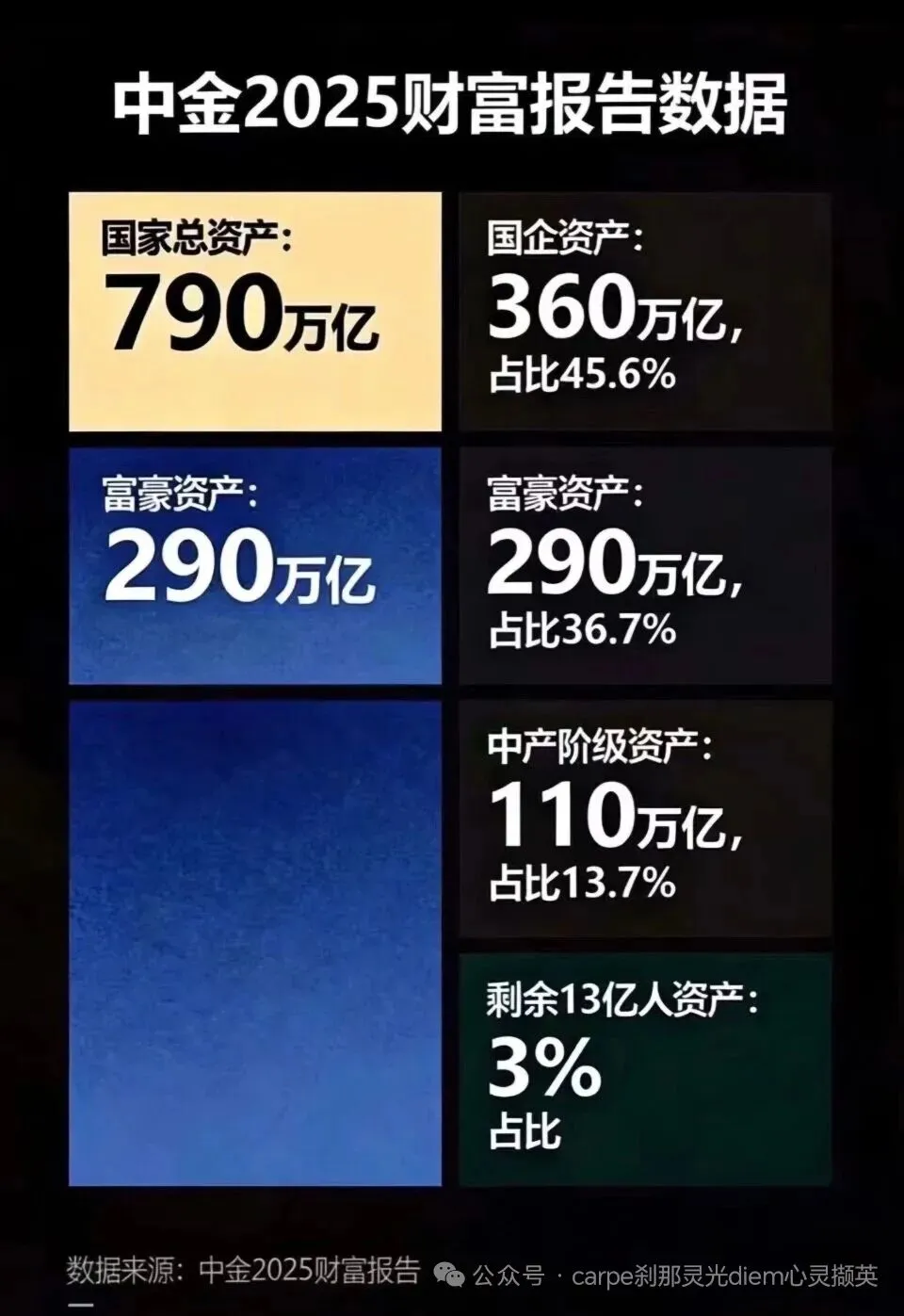 2025年中国社会总资产达790万亿元。其中国有资产占比45.6%(360万亿元),私人资产占比54.4%(430万亿元)。前1%人口占有31.4%的社会财富,前10%人口占有68.7%,而底层50%人口仅占2.3%。