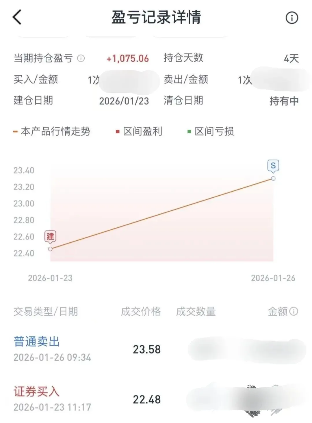 1月26日清晨,开盘前的集合竞价阶段,我看到股价高开并快速拉升,当触及23.58元的目标价位时,我果断执行了卖出指令。成交的瞬间没有想象中的兴奋,反而有一种如释重负的平静。看着最终定格的盈利数字,我明白这1075.06元背后,是四次关键的决策时刻:建仓时的理性分析、回调时的坚定持有、上涨时的克制贪婪,以及卖出时的果断执行。