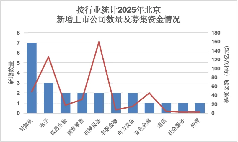 2025年北京新增上市公司行业分布紧扣科创中心建设战略导向,硬科技与高端制造领域成为绝对核心力量,呈现“头部集聚、多点协同”的鲜明格局。从数量维度看,计算机行业以7家企业稳居首位,占全年新增总量的29.17%;电子、医药生物、商贸零售、机械设备等行业分别贡献3家、2家、2家、2家企业,合计占比达37.5%。从募集资金规模看,高端制造领域表现尤为亮眼:机械设备行业仅2家企业便募集资金158.79亿元,占全年总募资额的35.07%;电子行业3家企业募集资金125.64亿元,占比27.75%,两大硬科技领域合计募资占比超62%,成为驱动融资规模增长的核心引擎。此外,有色金属(44.40亿元)、计算机(47.48亿元)、商贸零售(30.26亿元)等行业协同发力,进一步夯实了首都多产业融合发展的资本根基。