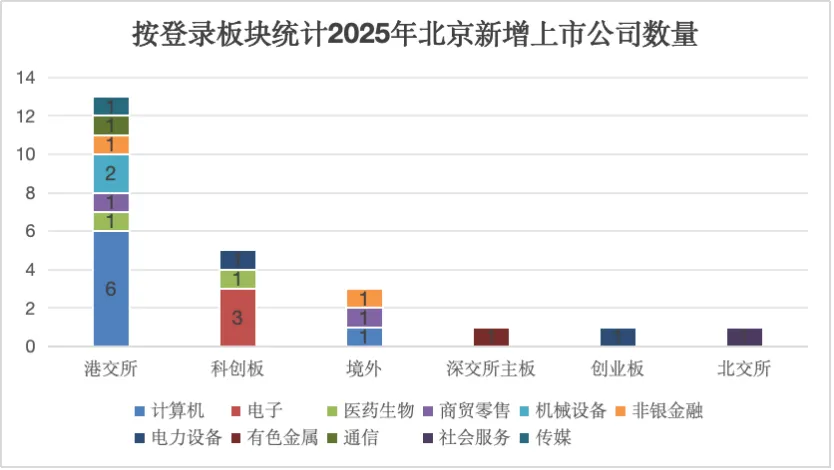 2025年,北京新增上市公司全面覆盖境内外多层次资本市场,板块布局持续优化,精准适配不同发展阶段企业的融资需求。其中,港交所成为最主要的上市渠道,全年新增13家上市公司,占比54.17%,三一重工、京东工业等行业龙头企业分别募资151.90亿元、28.82亿元,充分彰显了香港资本市场对北京大型优质企业的强大吸引力与认可度;科创板作为硬科技企业上市的核心阵地,全年新增5家上市公司,均聚焦电子、医药生物、电力设备等核心科创领域,摩尔线程-U、屹唐股份分别募资79.99亿元、24.97亿元,集中体现了北京硬科技企业的核心技术竞争力与市场价值。此外,境外市场、深交所主板、创业板、北交所分别新增3家、1家、1家、1家上市公司,形成“境内为主、境外补充,主板稳基、双创赋能”的多元上市格局,为首都企业高质量发展搭建了广阔的资本舞台。