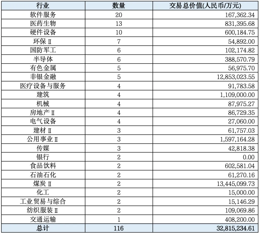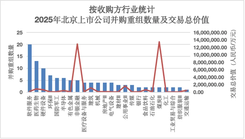 2025年北京上市公司并购重组行业分布兼顾战略导向与市场活力,硬科技领域整合力度持续加大,成为产业升级的核心主线。从收购方所处行业事件数量看,软件服务行业以20起并购事件位居首位,占比17.24%;医药生物、硬件设备行业分别以13起、10起紧随其后,合计占比19.83%,凸显了数字经济与生物医药领域旺盛的产业整合需求。从交易规模看,非银金融、煤炭Ⅱ行业分别以1285.30亿元、1344.51亿元的交易总价值,合计占全年总规模的80.14%,成为驱动交易规模增长的核心力量;半导体行业作为硬科技核心赛道,全年发生6起并购事件,交易总价值达38.86亿元,有效推动了核心技术资源的整合集聚,为产业自主可控奠定了坚实基础。