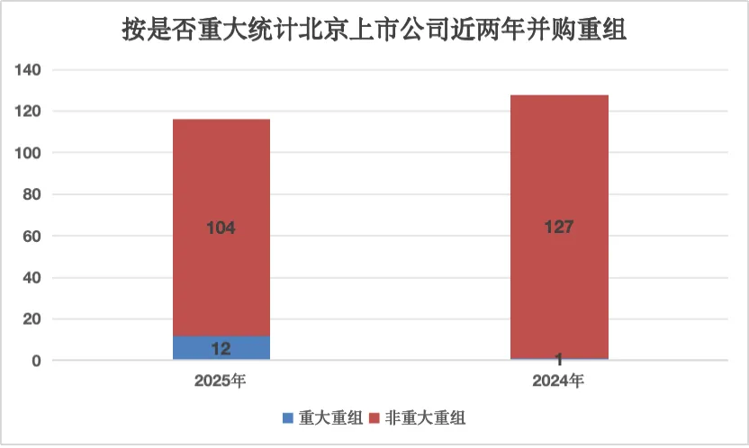 2025年,北京上市公司并购重组市场实现跨越式发展,成功从“数量驱动”向“质量驱动”深度转型,成为优化资源配置、推动产业迭代升级的核心力量。全年共发生并购重组事件116起,虽较2024年的128起略有调整,但交易总价值飙升至3281.52亿元,较2024年的694.12亿元激增372.76%;重大并购重组事件数量从2024年的1起跃升至12起,增幅达1100%,标志着北京上市公司并购重组市场的规模、质量与行业影响力实现同步跃升,资本服务产业升级的效能持续释放。