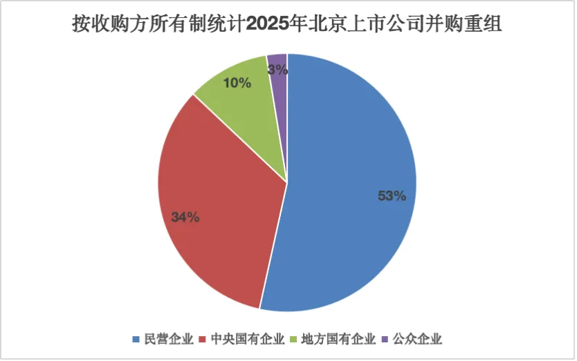 从收购方所有制性质看,多元主体协同发力的格局愈发清晰,民营企业始终是并购重组市场的活力源泉。2025年,民营企业发起并购重组事件62起,占比53.45%,充分展现了民营经济的市场活力与创新动力;中央国有企业发挥战略引领作用,发起并购重组事件39起,占比33.62%,重点聚焦煤炭Ⅱ、公用事业Ⅱ、半导体等关乎国计民生与核心技术的战略领域;地方国有企业、公众企业分别发起12起、3起并购事件,共同构建了市场化、多元化、高效率的并购重组生态体系。