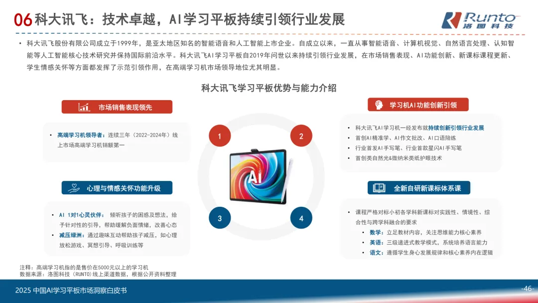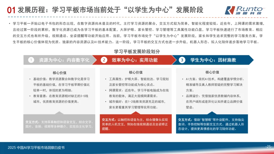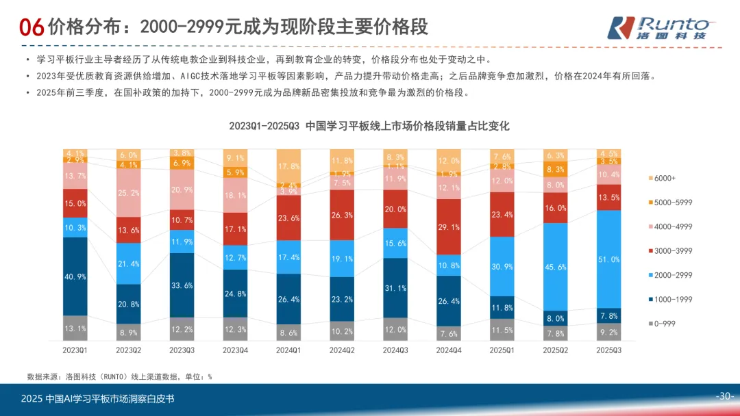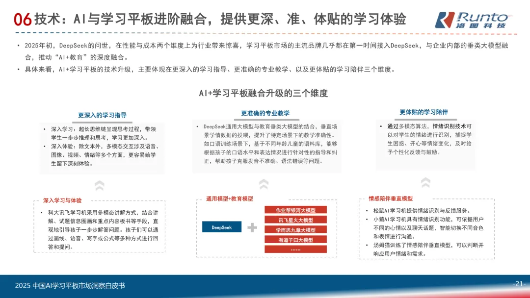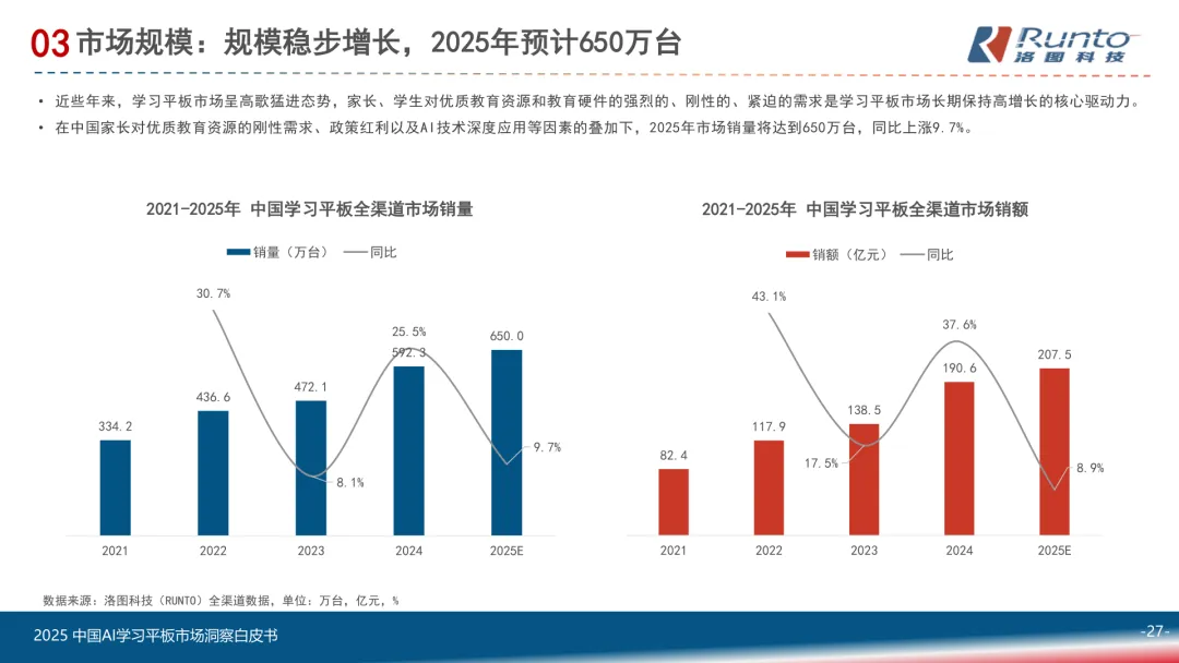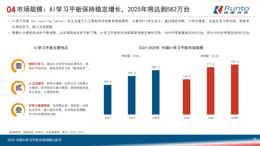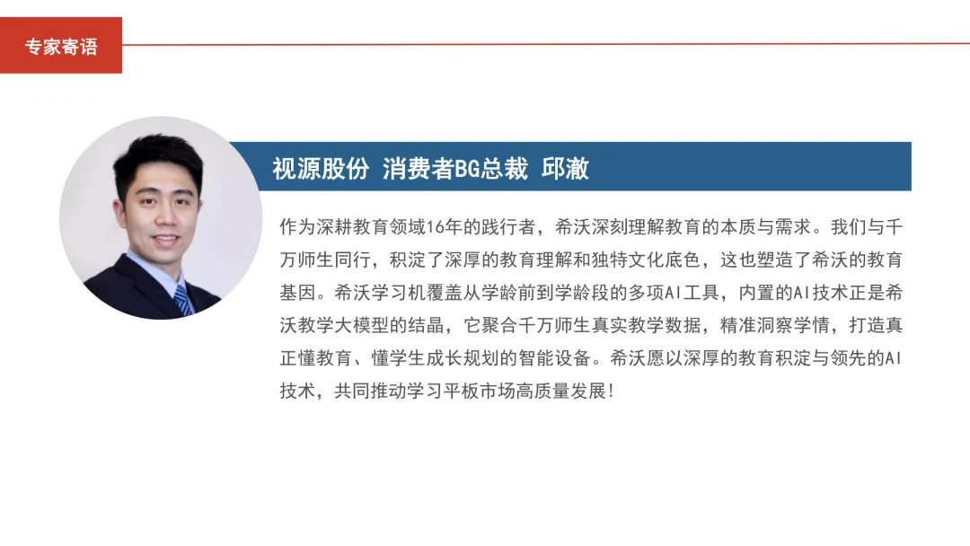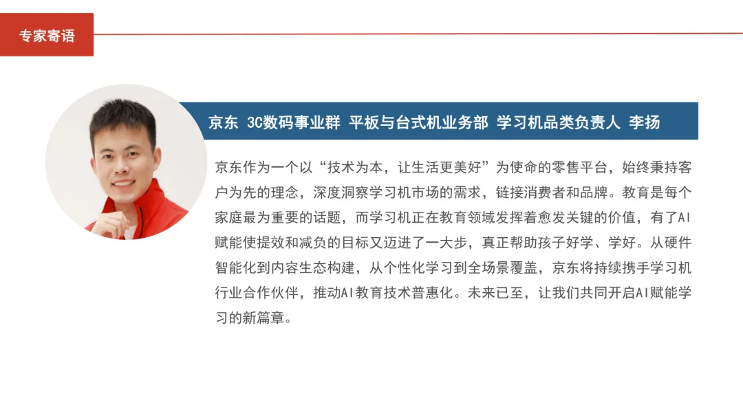 导读:AI 技术与教育的深度融合推动中国 AI 学习平板市场快速发展,2025 年市场销量预计达 582 万台,AI 渗透率持续提升。政策支持为市场发展提供有力保障,学习平板被纳入国补目录,多地推出购新补贴政策,教育数字化战略进一步明确其核心载体地位。市场呈现多元发展特征,2000-2999 元成为主流价格段,教育企业与科技企业共同主导市场。产品以个性化学习为核心,整合 AI 精准诊断、智能答疑、护眼技术等功能,通过通用大模型与教育垂类模型融合,实现从知识传授到能力培养的转型。线上内容电商与线下体验店、AI 智习室形成多元渠道布局。未来,市场将向场景细分、形态创新与生态融合方向演进。学龄段覆盖向成人职业教育延伸,便携形态与多硬件协同生态逐步成型,预计 2028 年市场规模将突破 800 万台,AI 渗透率超 96%,持续推动教育公平与效率提升。