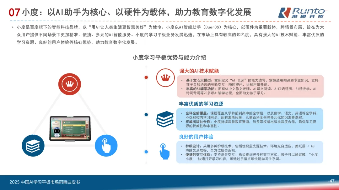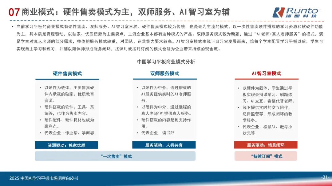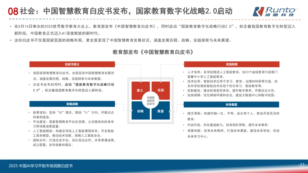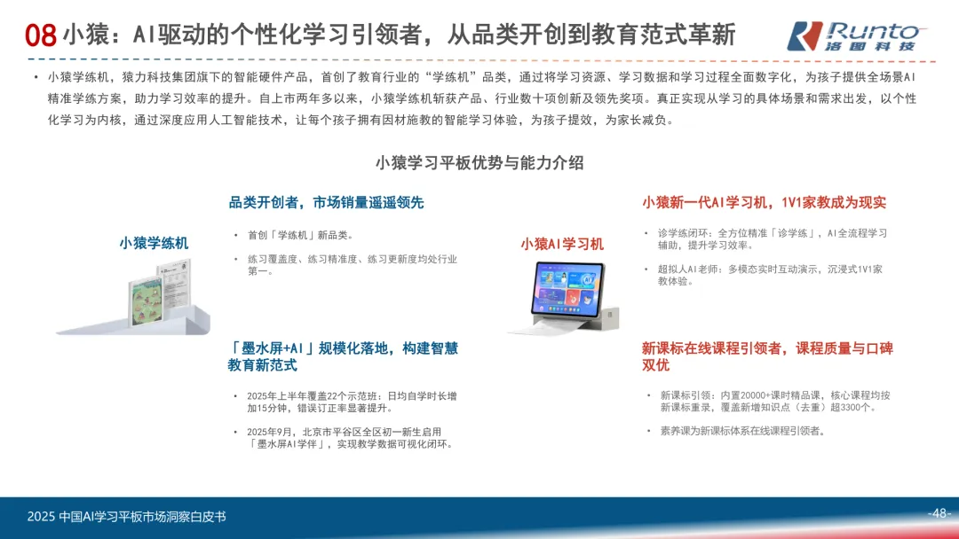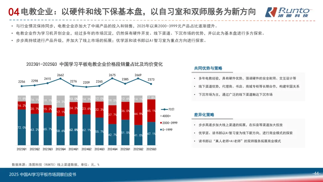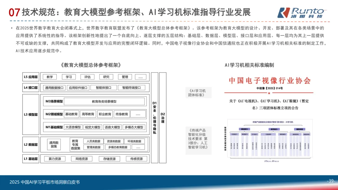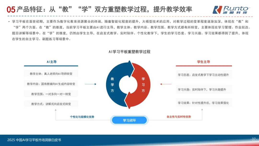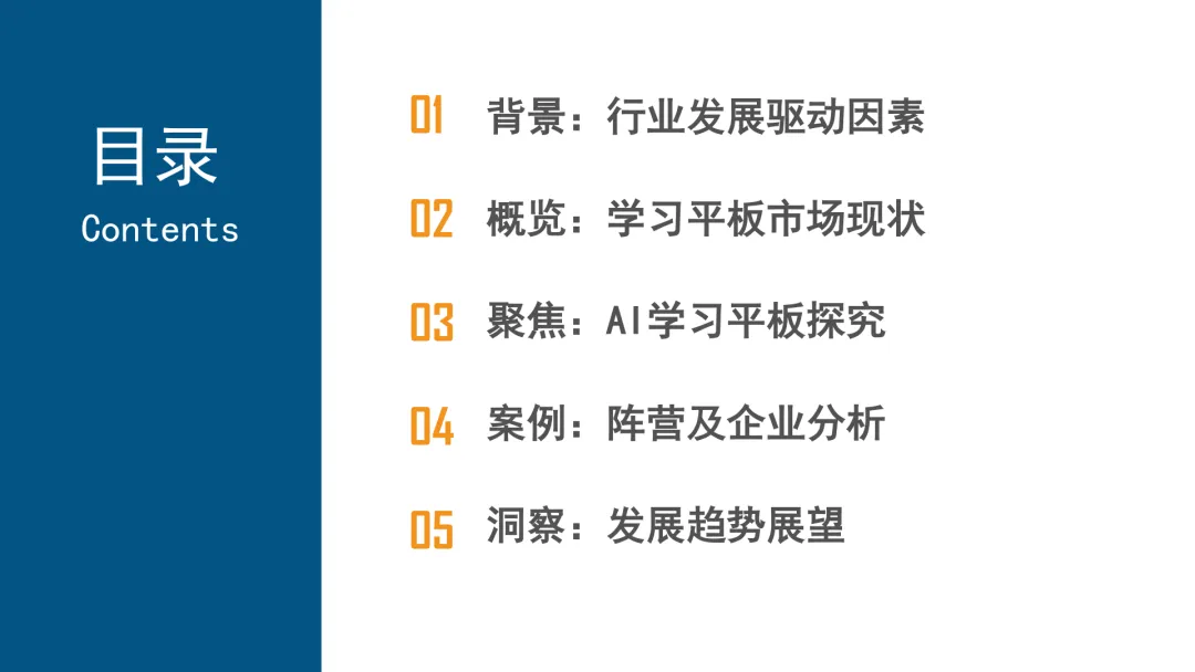 导读:AI 技术与教育的深度融合推动中国 AI 学习平板市场快速发展,2025 年市场销量预计达 582 万台,AI 渗透率持续提升。政策支持为市场发展提供有力保障,学习平板被纳入国补目录,多地推出购新补贴政策,教育数字化战略进一步明确其核心载体地位。市场呈现多元发展特征,2000-2999 元成为主流价格段,教育企业与科技企业共同主导市场。产品以个性化学习为核心,整合 AI 精准诊断、智能答疑、护眼技术等功能,通过通用大模型与教育垂类模型融合,实现从知识传授到能力培养的转型。线上内容电商与线下体验店、AI 智习室形成多元渠道布局。未来,市场将向场景细分、形态创新与生态融合方向演进。学龄段覆盖向成人职业教育延伸,便携形态与多硬件协同生态逐步成型,预计 2028 年市场规模将突破 800 万台,AI 渗透率超 96%,持续推动教育公平与效率提升。