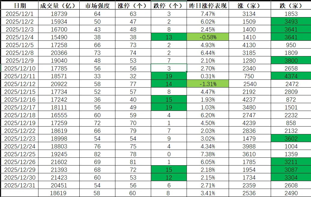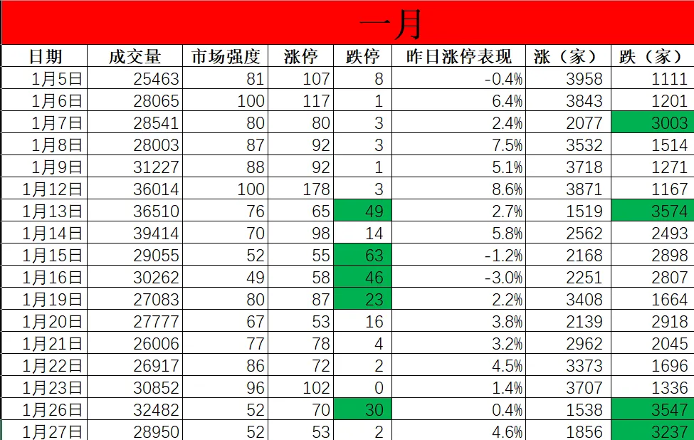 以我自己统计的市场数据(全部来自开盘啦,2025年5月至今),市场强度为100的,7月1次,今年1月有2次。涨停大于100个的,2025年7月1次,8月1次,9月1次,今年1月4次。这两个数据可以等同为市场的最高潮,接下来的交易日,好一点的情况是高位震荡,最差的就是直接情绪冰点。基本没有强上更强!最典型的就是1月12日,强度100,178个涨停,1月13日强度76,涨停家数回落至76,有49个跌停。1月15日63个跌停达到冰点高潮,1月16日跌停降至46个,直到1月20日跌停16个才算是看到有市场有修复的可能。从跌停数来看,去年5月、10月最为温和,超过10家的就两天。