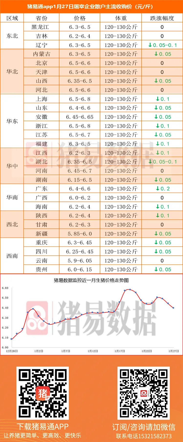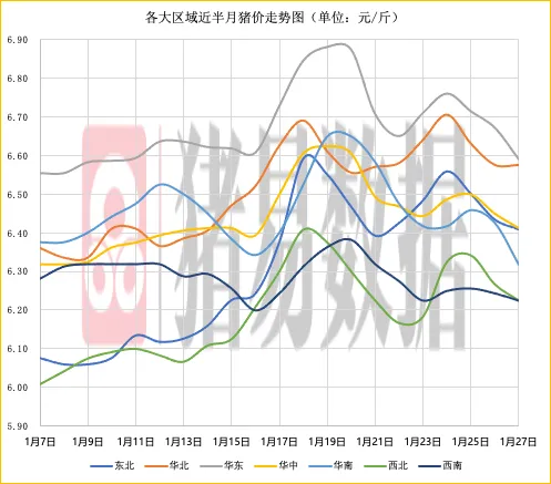 东北、西北、华中、华东、西南、华南地区猪价呈现下跌,华北地区猪价呈现稳定,生猪平均价格微幅下跌。