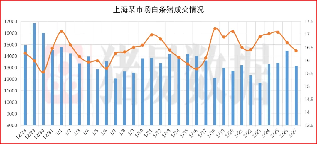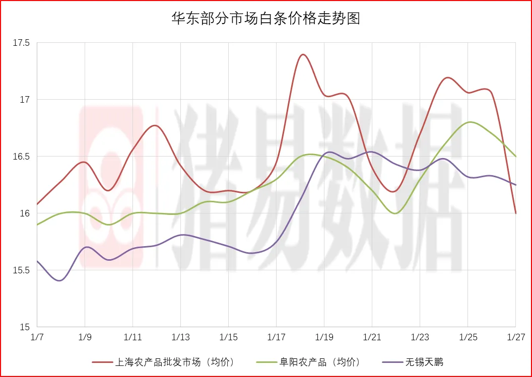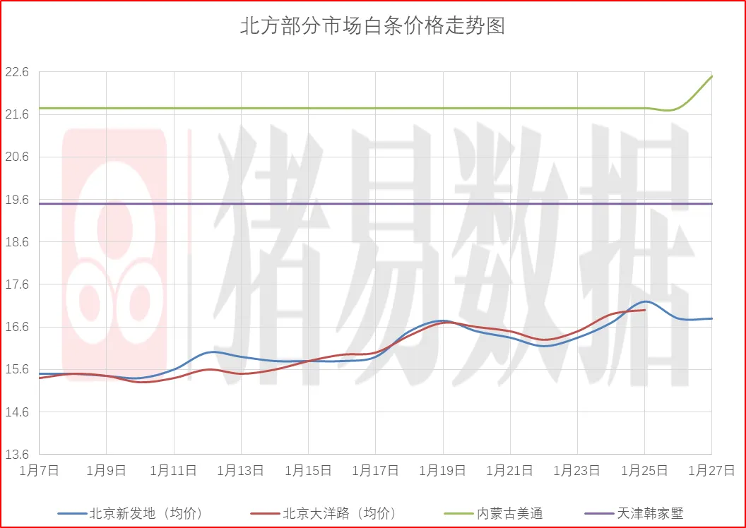 从今日北京、上海消费城市批发市场白条价格走势来看,北京、上海批发市场白条开磅价格呈现稳中伴跌,北京大部分市场开磅价格下跌0.2元/公斤,市场走货速度表现一般偏差;上海市场价格呈现下跌态势,部分市场成交价参考16.0-16.37元/公斤,到货量表现有所减少,市场交易情绪表现偏差,市场成交均价表现偏差。
