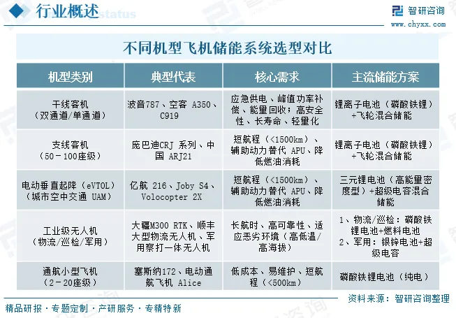 针对不同机型的运行特点与技术需求,飞机储能系统的选型呈现明显差异。干线客机以磷酸铁锂电池+飞轮混合储能保障安全与峰值功率,仅作辅助应急与能量回收;支线客机选高镍三元锂+超级电容,适配短航程与APU替代需求;eVTOL采用350–400Wh/kg高倍率三元锂+超级电容组合,满足垂直起降高功率与低空短航程;工业级无人机按场景分物流/巡检用磷酸铁锂+燃料电池(追求长航时)、军用用银锌电池+超级电容(适应极端环境);通航小型飞机以低成本磷酸铁锂电池为主,适配2–20座短航程场景,整体选型核心是匹配机型的安全、航程、功率、成本与环境适应性需求,混合储能是中大型机型主流,纯电方案多用于小型与低空机型。
