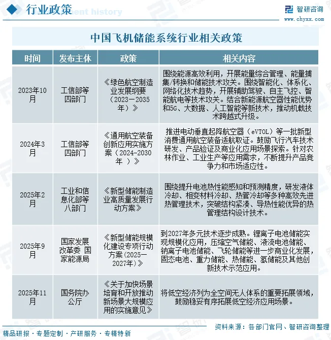 飞机储能系统是集成储能介质、功率转换、控制管理与安全防护的综合系统,是多电/全电飞机与电动航空实现能量存储、管理及按需释放的核心装备,承担应急供电、功率缓冲、能量回收与系统稳定等关键功能,近年来,我国高度重视储能行业发展,出台《绿色航空制造业发展纲要(2023—2035年)》《通用航空装备创新应用实施方案(2024-2030年)》《新型储能制造业高质量发展行动方案》《新型储能规模化建设专项行动方案(2025—2027年)》《关于加快场景培育和开放推动新场景大规模应用的实施意见》等政策,从技术研发补贴、适航认证体系建设、示范应用场景拓展、产业链协同创新等多维度提供支撑,明确了高能量密度电池、混合储能系统等核心技术的攻关方向,提出了eVTOL、干线/支线客机储能系统的产业化目标,为飞机储能系统突破适航壁垒、加速技术迭代、实现商业化落地奠定了坚实的政策基础。