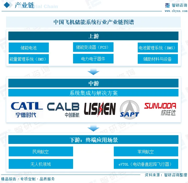 中国飞机储能系统行业产业链上中下游紧密关联,共同推动行业发展。上游聚焦核心设备与材料供应,包括锂离子电池、氢燃料电池等储能电池,以及储能变流器(PCS)、电池管理系统(BMS)、能量管理系统(EMS)等关键设备,其中储能电池成本占比最大,是产业链价值核心;中游为系统集成与解决方案环节,企业通过整合上游部件,形成完整储能系统,并提供安装、调试与运维服务,技术壁垒与增值服务能力成为竞争关键;下游则覆盖民用航空、军用航空、无人机等多元化应用场景,市场需求与技术迭代形成双向驱动,推动储能系统在飞机动力辅助、能源管理、应急供电等领域的持续拓展。