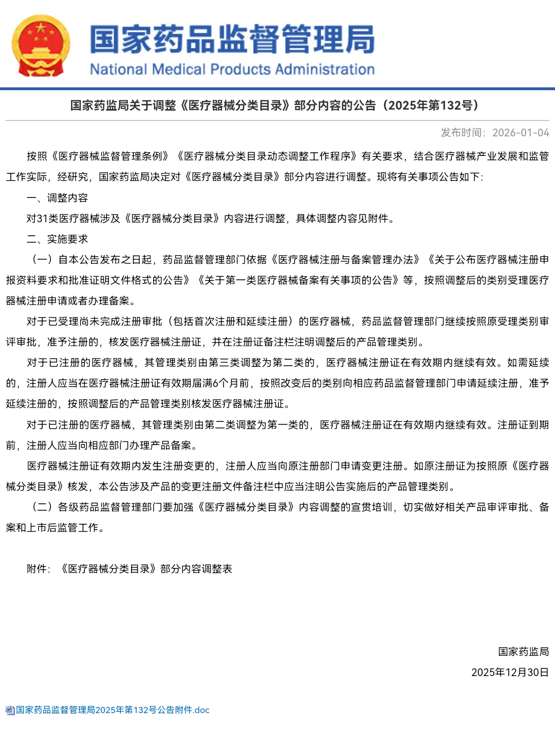 1 | 国家药监局关于调整《医疗器械分类目录》部分内容的公告(2025年第132号) | https://www.nmpa.gov.cn/xxgk/ggtg/ylqxggtg/ylqxqtggtg/20260104173409116.html | 2026. 01.04 |