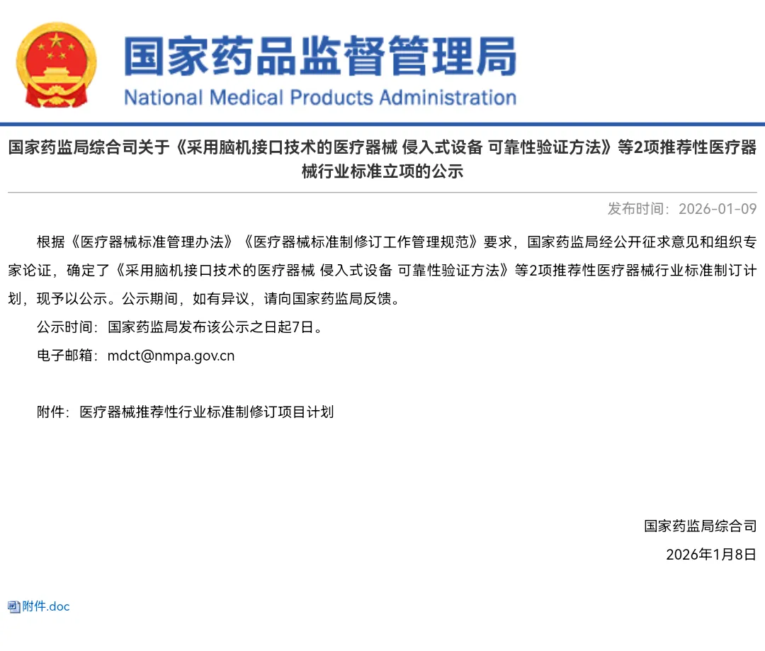 2 | 国家药监局综合司关于《采用脑机接口技术的医疗器械 侵入式设备 可靠性验证方法》等2项推荐性医疗器械行业标准立项的公示 | https://www.nmpa.gov.cn/xxgk/ggtg/ylqxggtg/ylqxqtggtg/20260109170529189.html | 2026. 01.09 |