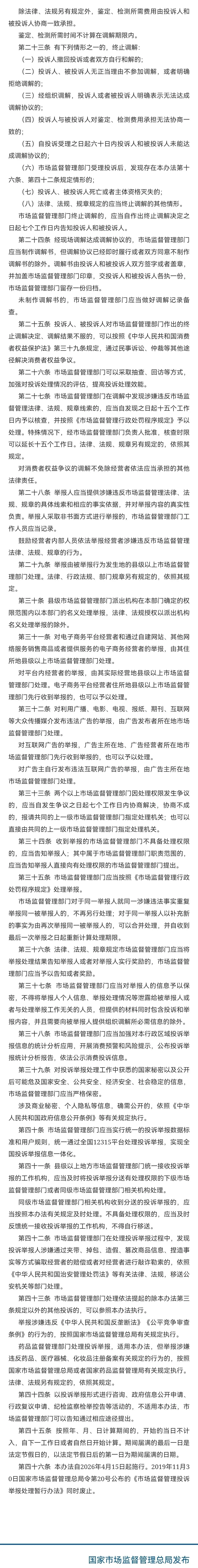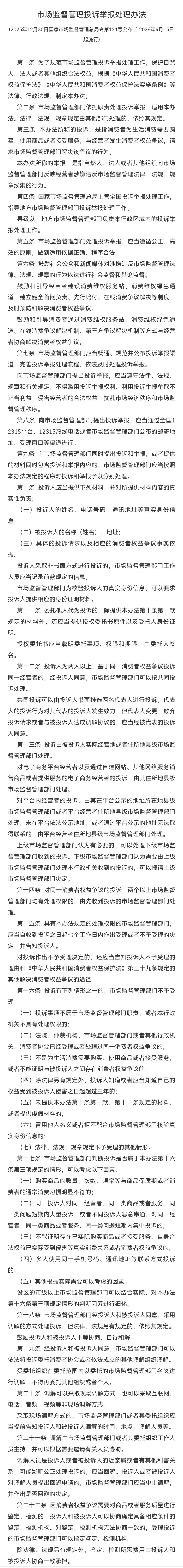 3 | 市场监督管理投诉举报处理办法 | https://www.samr.gov.cn/zw/zfxxgk/fdzdgknr/fgs/art/2026/art_e4d03a20c0fd49769e408c7bf3791ff5.html | 2026. 01.16 |