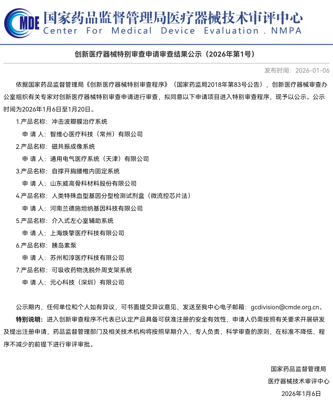 1 | 创新医疗器械特别审查申请审查结果公示(2026年第1号) | https://www.cmde.org.cn/xwdt/zxyw/20260106101058107.html | 2026. 01.06 |