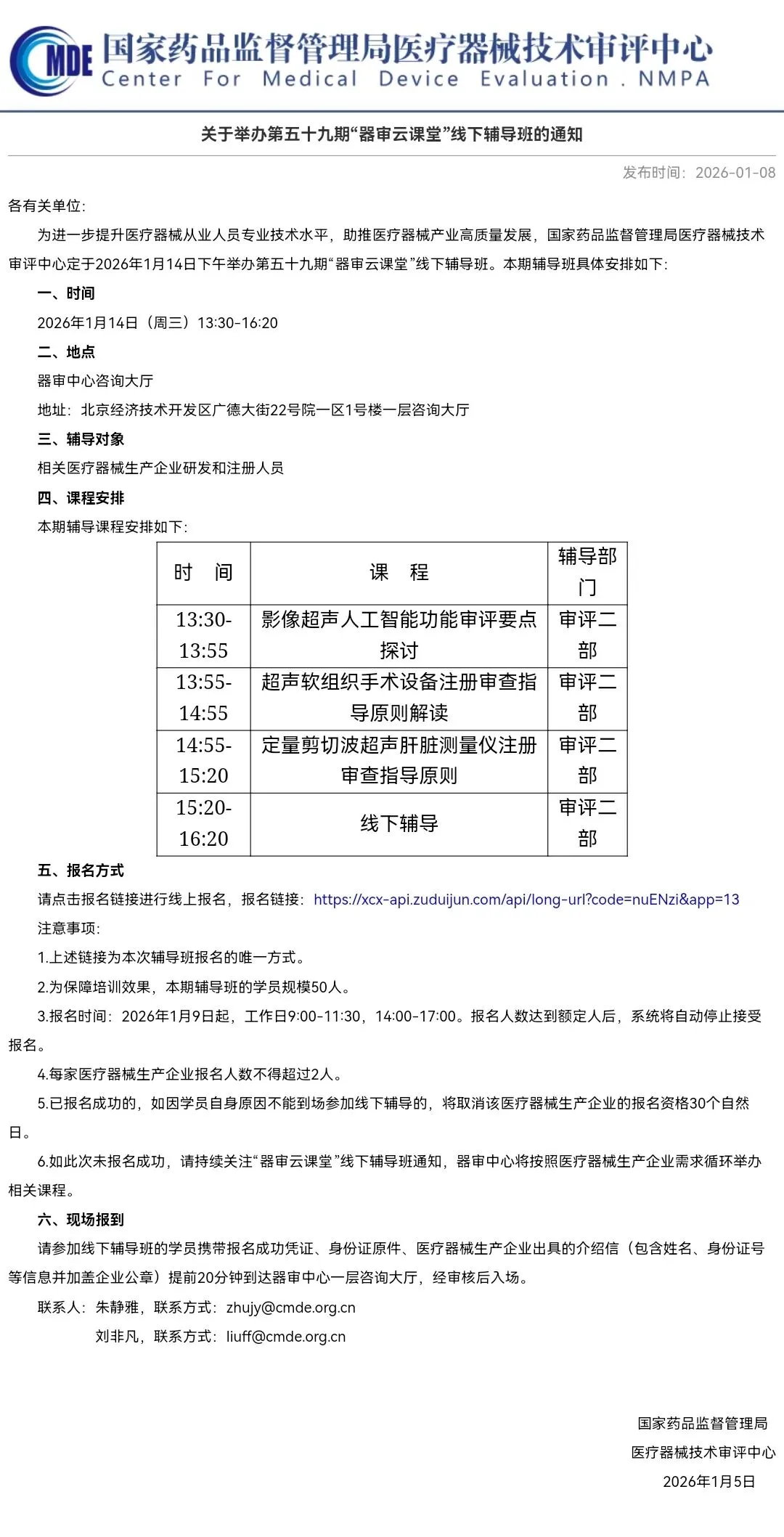 2 | 关于举办第五十九期“器审云课堂”线下辅导班的通知 | https://www.cmde.org.cn/xwdt/zxyw/20260108084817110.html | 2026. 01.08 |