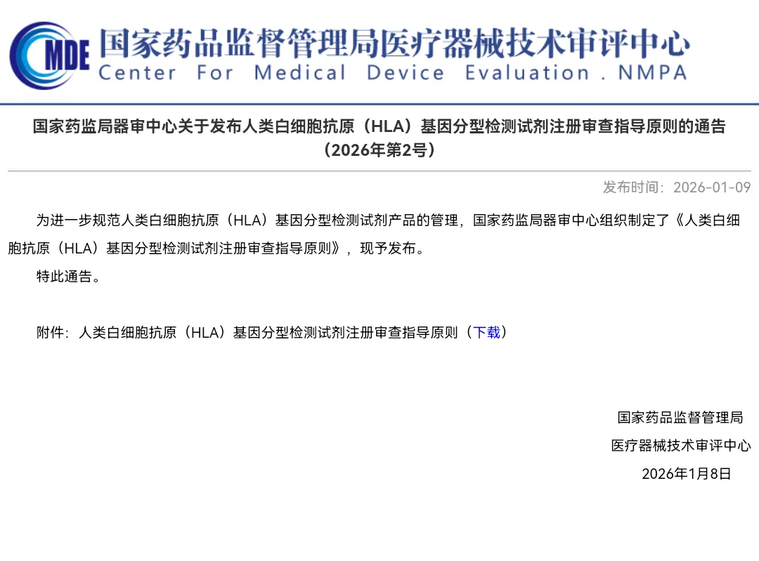 4 | 国家药监局器审中心关于发布人类白细胞抗原(HLA)基因分型检测试剂注册审查指导原则的通告(2026年第2号) | https://www.cmde.org.cn/xwdt/zxyw/20260109150714115.html | 2026. 01.09 |