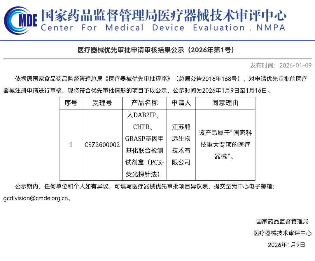 5 | 医疗器械优先审批申请审核结果公示(2026年第1号) | https://www.cmde.org.cn/xwdt/zxyw/20260109160555151.html | 2026. 01.09 |