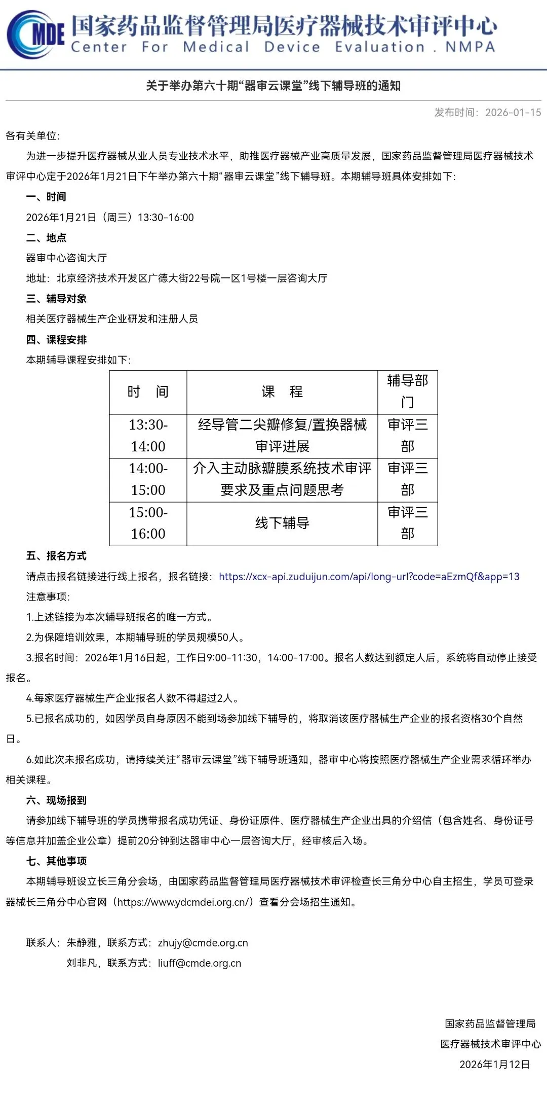 7 | 关于举办第六十期“器审云课堂”线下辅导班的通知 | https://www.cmde.org.cn/xwdt/zxyw/20260115084918111.html | 2026. 01.15 |