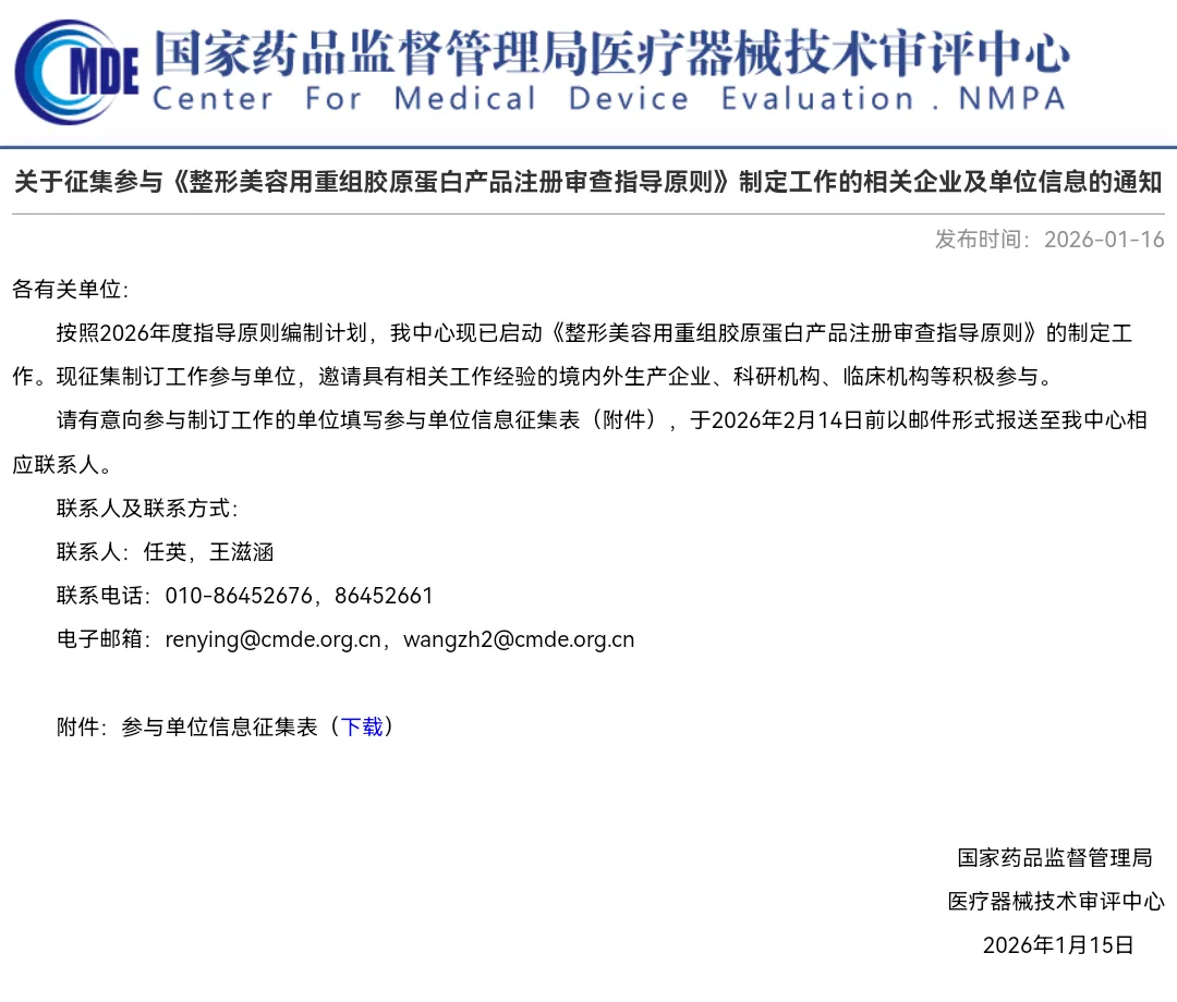 8 | 关于征集参与《整形美容用重组胶原蛋白产品注册审查指导原则》制定工作的相关企业及单位信息的通知 | https://www.cmde.org.cn/xwdt/zxyw/20260116133834123.html | 2026. 01.16 |