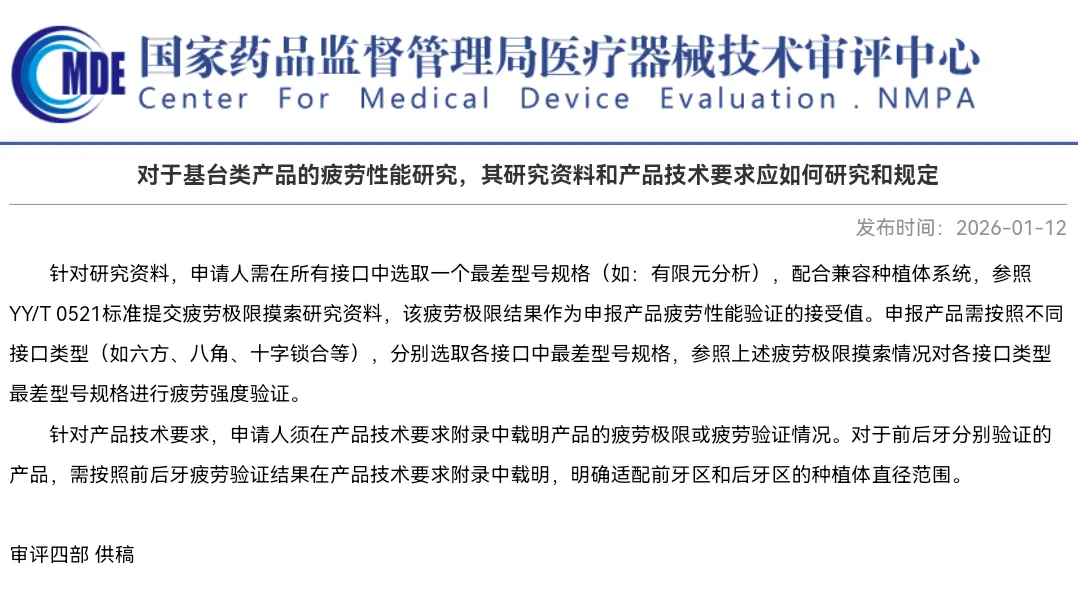 1 | 对于基台类产品的疲劳性能研究,其研究资料和产品技术要求应如何研究和规定 | https://www.cmde.org.cn/splt/ltgxwt/20260112140111125.html | 2026. 01.12 |