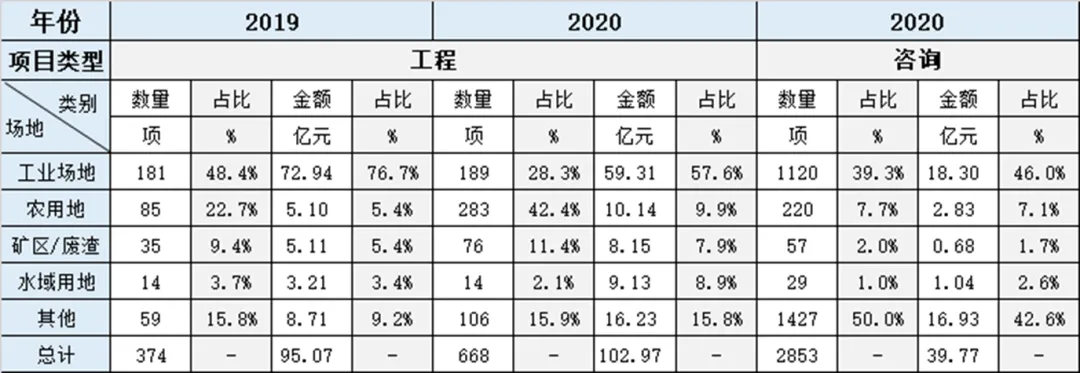 2019-2020年工程及咨询项目不同用地类型的项目数量和项目金额分析