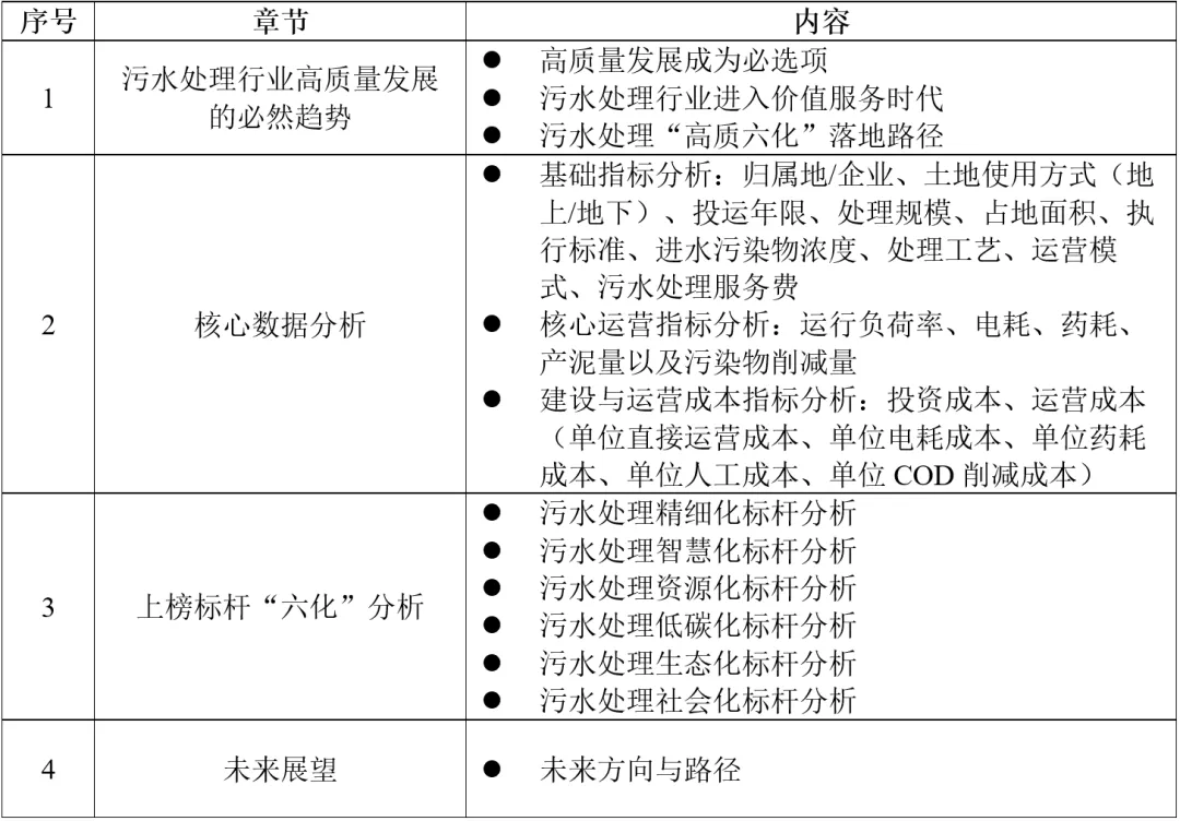 《污水处理高质量发展年度报告2022》包括四个章节:污水处理行业高质量发展的必然趋势、核心数据分析、上榜标杆“六化”分析、未来展望。