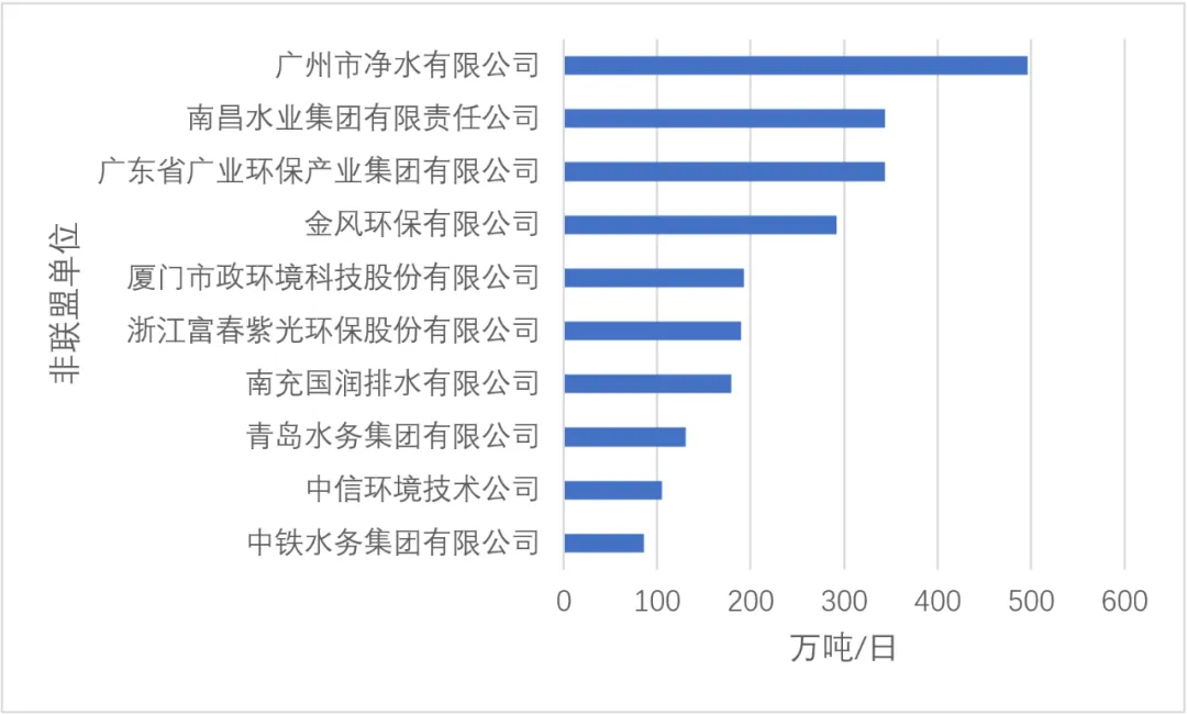从10家非联盟单位看,已投入运营城镇污水处理总规模达到接近2400万吨/日,其中,已投入运营城镇污水处理规模均在500万吨/日以内,已投入运营城镇污水处理规模在200~500万吨/日有4家企业,分别是广州市净水有限公司、南昌水业集团有限责任公司、广东省广业环保产业集团有限公司、金风环保有限公司。