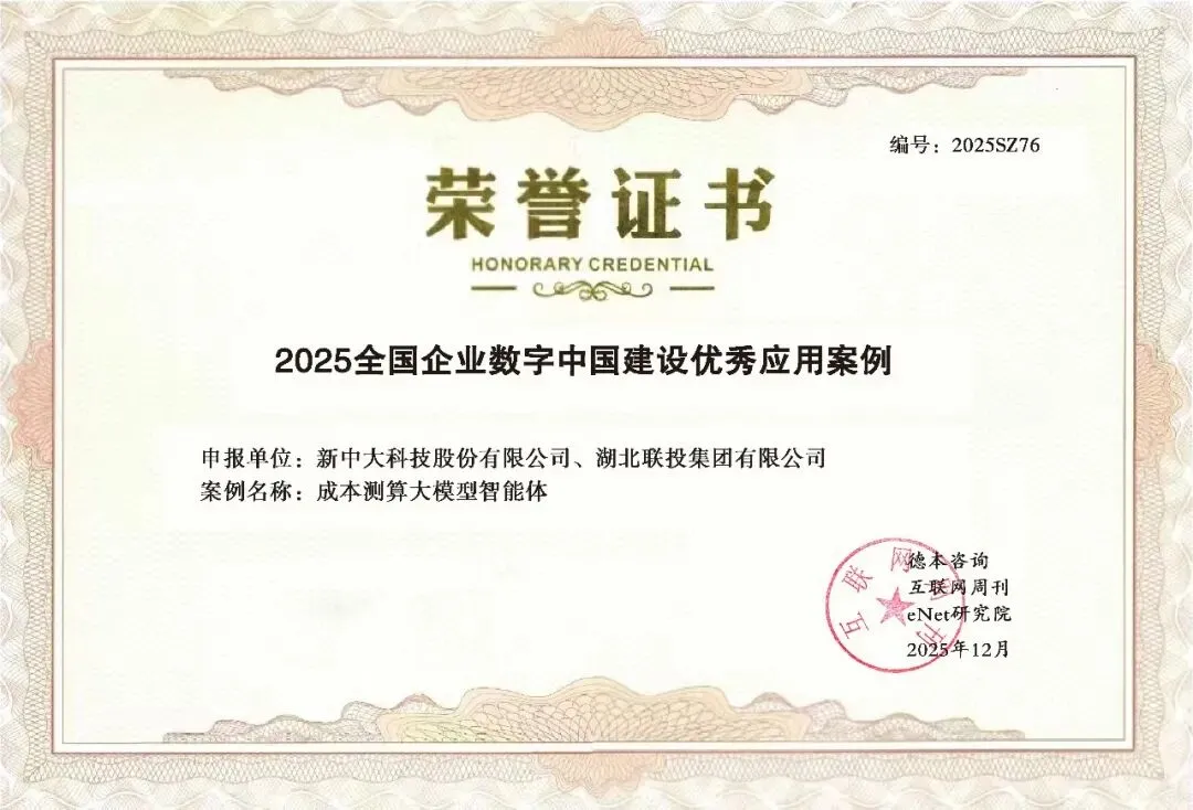 近日,在由德本咨询、互联网周刊与eNet研究院联合主办的“2025(第二十三届)中国互联网经济论坛”上,新中大科技股份有限公司携手湖北联投集团共同申报的“成本测算大模型智能体”项目,成功入选“2025全国企业数字中国建设优秀应用案例”。